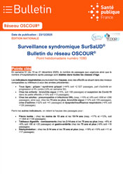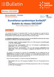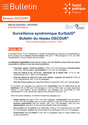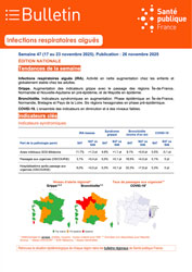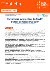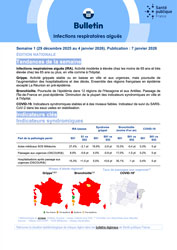 Grippe/Syndrome Grippal: En S1, l'activité grippale était contrastée selon les classes d'âge et le type de recours aux soins, toujours portée par une co-circulation des virus A(H1N1)pdm09 et A(H3N2). La part d'activité pour grippe/syndrome grippal était stable ou en diminution et d'intensité modérée en ville et aux urgences tous âges confondus. En revanche, la part d’activité pour grippe/syndrome grippal parmi les hospitalisations après passage aux urgences continuait d’augmenter et se situait à un niveau d'intensité élevée tous âges confondus et chez les 65 ans et plus. La part de la grippe parmi les décès déclarés par certificat électronique et le nombre d'épisodes de cas groupés d'IRA en EMS exclusivement attribués à la grippe continuaient d’augmenter en S01. Au total, ces données indiquent qu'un pic d'activité a été atteint en S51 en ville et en S52 aux urgences. Compte-tenu de la circulation toujours soutenue des virus grippaux dans l’ensemble de la population française et des prévisions de la dynamique de l’épidémie en France hexagonale établies par l’Institut Pasteur et Santé publique France, grâce à des travaux de modélisation publiés sur le site de Santé publique France, la possibilité d’une reprise de l’épidémie en janvier ne peut être exclue à ce stade.