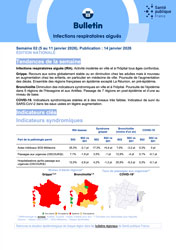 *Grippe/Syndrome Grippal: Selon SPF, ”après une diminution observée en médecine de ville entre les semaines 51/2025 et 01/2026, l'activité pour syndrome grippal repartait à la hausse en S02 tous âges confondus. Cette tendance était particulièrement marquée chez les enfants de moins de 15 ans. A l'hôpital, la part d'activité pour grippe/syndrome grippal parmi les passages aux urgences et les hospitalisations après passage diminuait tous âges confondus et chez les adultes, se stabilisait chez les 5-14 ans et augmentait à nouveau chez les moins de 5 ans. Le taux de positivité pour grippe était stable ou en diminution en ville et à l'hôpital tous âges confondus, tout en demeurant à des niveaux modérés, traduisant une circulation toujours active des virus grippaux. Ceux-ci étaient toujours très majoritairement de type A, avec une co-circulation des sous-types A(H1N1)pdm09 et A(H3N2). La part de la grippe parmi les décès déclarés par certificat électronique était toujours en augmentation en S02, atteignant le niveau atteint au pic de l'épidémie 2024-25 (7%), et un excès de mortalité toutes causes était observé en S01. Enfin, le nombre d'épisodes de cas groupés d'IRA signalés en EMS et exclusivement attribués à la grippe continuait d’augmenter en S01. Cette reprise à la hausse de la circulation des virus grippaux chez les enfants, consécutive à la rentrée scolaire début janvier, pourrait entraîner une recrudescence du recours aux soins chez les adultes dans les semaines à venir. Il est toutefois très difficile d'anticiper l'impact qu'une telle reprise épidémique pourrait avoir sur le système de soins. En Outre-mer, l'ensemble des régions étaient en épidémie excepté La Réunion, à nouveau en pré-épidémie depuis la S01.”