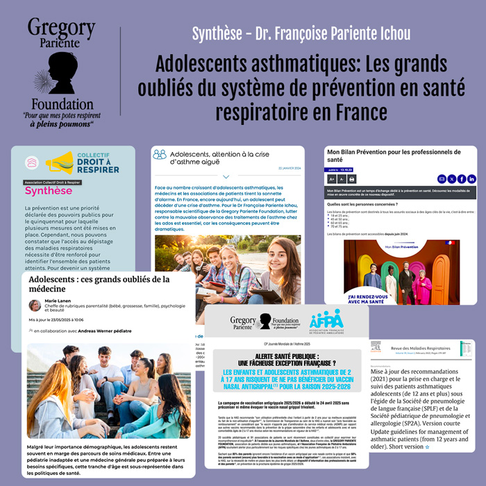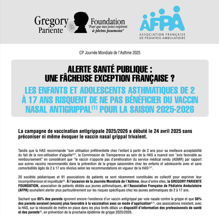 20 sociétés pédiatriques et 91 associations de patients se sont récemment constituées en collectif pour exprimer leur incompréhension et inquiétude(3). À l’occasion de la Journée Mondiale de l’Asthme, deux d’entre elles, la GREGORY PARIENTE FOUNDATION, association de patients dédiée aux jeunes asthmatiques, et l’Association Française de Pédiatrie Ambulatoire (AFPA) souhaitent alerter plus particulièrement sur les risques spécifiques chez les jeunes asthmatiques de 2 à 17 ans.