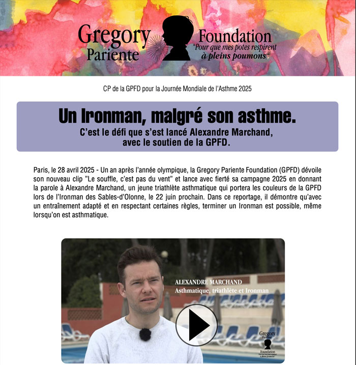 Paris, le 28 avril 2025 - Un an après l’année olympique, la Gregory Pariente Foundation (GPFD) dévoile son nouveau clip ”Le souffle, c’est pas du vent” et lance avec fierté sa campagne 2025 en donnant la parole à Alexandre Marchand, un jeune triathlète asthmatique qui portera les couleurs de la GPFD lors de l’Ironman des Sables-d’Olonne, le 22 juin prochain. Dans ce reportage, il démontre qu’avec un entraînement adapté et en respectant certaines règles, terminer un Ironman est possible, même lorsqu’on est asthmatique.
