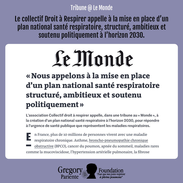 Dans une tribune publiée hier dans le journal Le Monde, le Collectif Droit à Respirer appelle à la mise en place d’un plan national santé respiratoire, structuré, ambitieux et soutenu politiquement à l’horizon 2030.