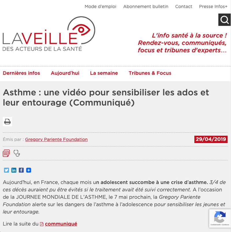 Une vidéo mise en ligne par la fondation Gregory Pariente met en scène un enfant qui s'essouffle en jouant au tennis. Il n'a pas pris son traitement contre l'asthme. Un peu plus tard, dans une salle de classe, un garçon s'inquiète de l'absence de son copain. Vient alors l'annonce terrible : il n'a pu arriver en vie à l'hôpital.