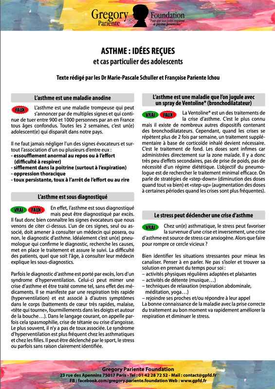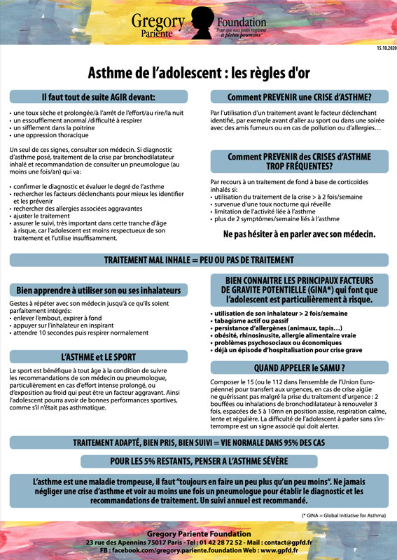 La Gregory Pariente Foundation est heureuse de vous présenter un nouvel outil incontournable… Les Dr Marie-Pascale Schuller et Françoise Pariente Ichou ont réuni leurs connaissances et leurs expériences pour proposer aux éducateurs sportifs un mode d'emploi simple et didactique pour parfaitement gérer les adolescents asthmatiques.