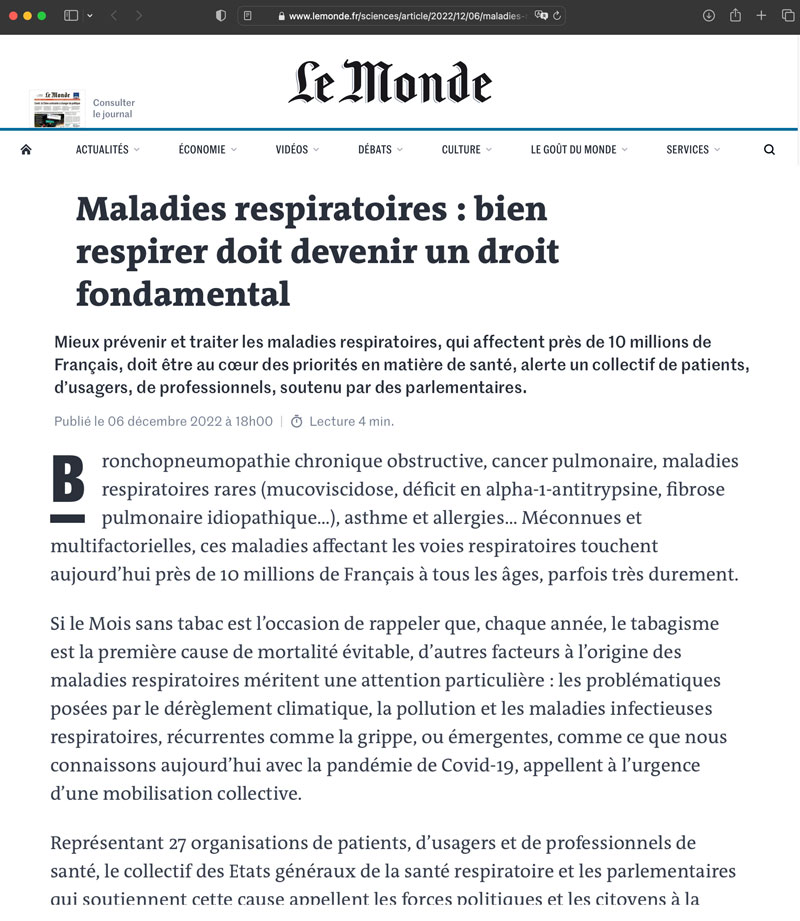 Par le biais de cette tribune parue le mercredi 7 décembre dans le Monde, le Collectif des EGSR a choisi de faire connaitre toutes les maladies respiratoires: BPCO, Asthme et allergies, cancer pulmonaire et de nombreuses maladies respiratoires rares ; elles sont multifactorielles, trop souvent méconnues et touchent, parfois très durement, près de 10 millions de patients Français à tous les âges.