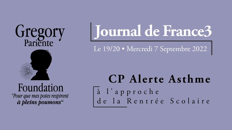 Le communiqué de presse que nous avons fait paraître fin août a eu des retombées intéressantes. "Alerte Asthme à l'approche de la rentrée scolaire - L'occasion de parler du polyallergique à haut risque d’exacebation asthmatique" a retenu l'attention des journaux de France3 ; le 12/13 et le 19/20. Le Dr. Françoise Pariente Ichou, responsable scientifique de la GPFD, y est interrogée. Sandra Wachlewicz, journaliste de France3, a centré ses questions sur l'alerte Asthme à l'approche de la rentrée scolaire, tout en précisant que chez le polyallergique, le risque d'exacerbations asthmatiques est grandement augmenté.