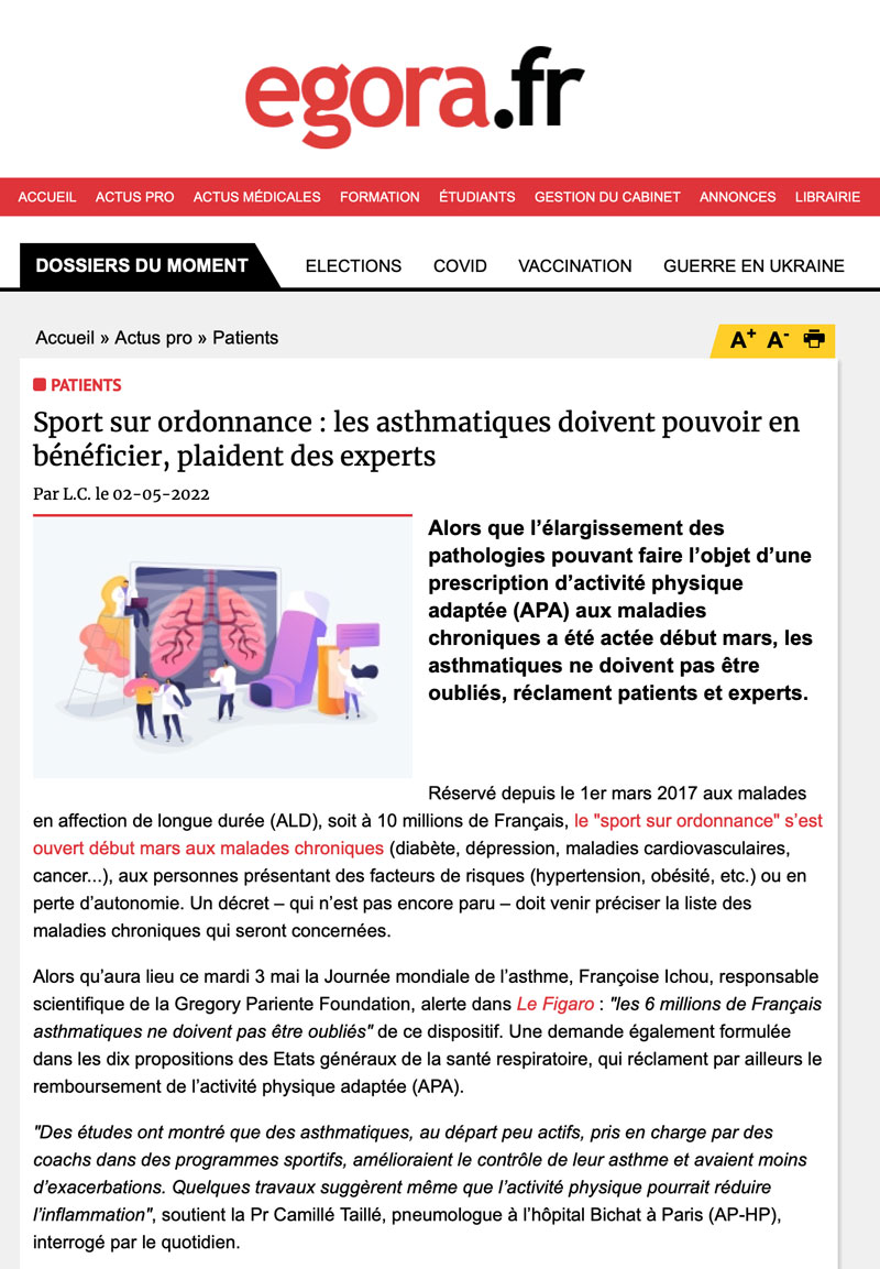 Très intéressant article de Mme. Marielle Ammouche dans Egora du 2 mai 2022. Il s’intitule "Sport sur ordonnance: les asthmatiques doivent pouvoir en bénéficier, plaident des experts".