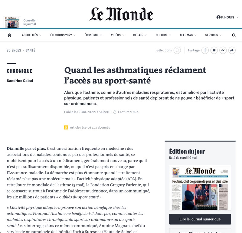 Excellent article signé Sandrine Cabut dans Le Monde: Quand les asthmatiques réclament l'accès au sport-santé. Alors que l’asthme, comme d’autres maladies respiratoires, est amélioré par l’activité physique, patients et professionnels de santé déplorent de ne pouvoir bénéficier de "sport sur ordonnance".