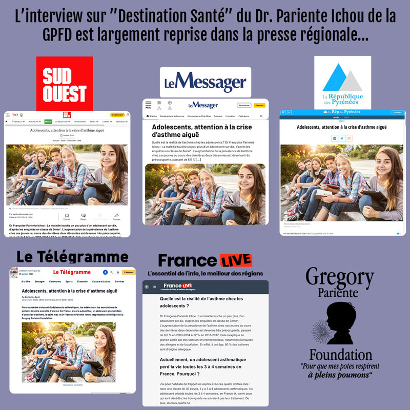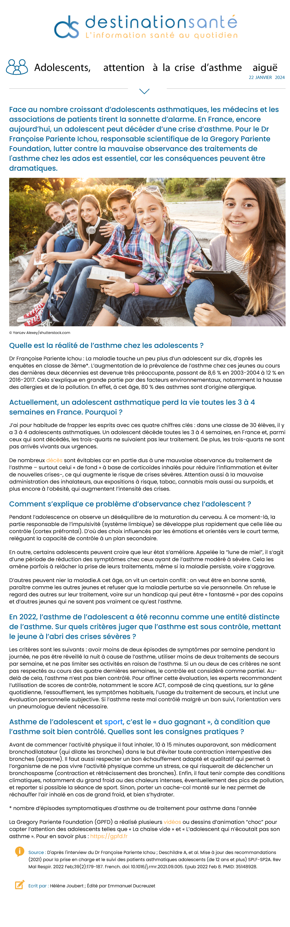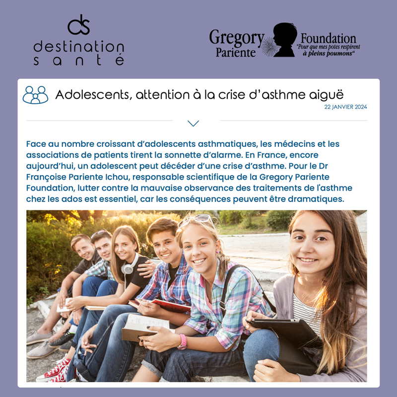Destination santé a choisi de se pencher sur les dangers d’une crise d’asthme aiguë chez l’adolescent. Hélène Joubert, journaliste pour Destination Santé a choisi d’interviewer le Dr. Françoise Pariente Ichou, responsable scientifique de la Gregory Pariente Foundation ( GPFD) pour répondre aux questions clés sur cet asthme de l’adolescent si particulier.