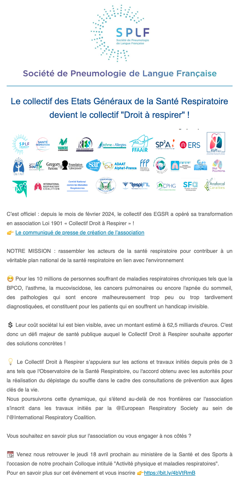Demain, Jeudi 18 Avril 2024, se tiendra au ministère de la santé, le troisième colloque du collectif des États généraux de la Santé Respiratoire. Le thème sera l'Activité Physique & Maladies Respiratoires; Quels enjeux pour la santé respiratoire à l’horizon des Jeux Olympiques et Paralympiques 2024. Le Collectif Droit À Respier, qui rassemble 26 organisations représentant patients, professionnels de santé et usagers, sera largement représenté.