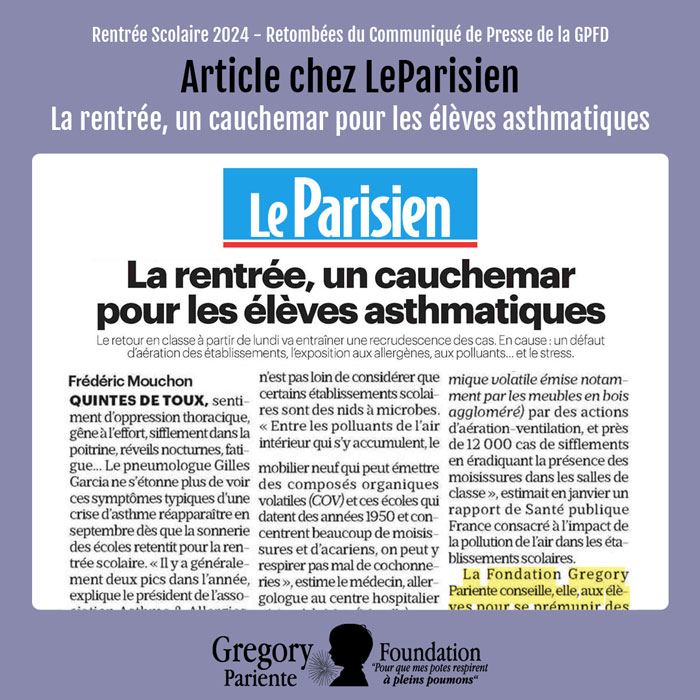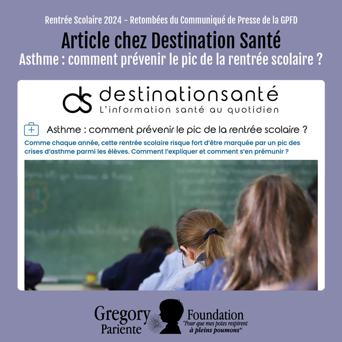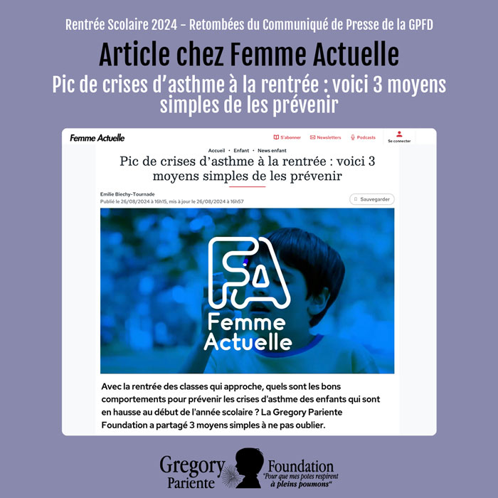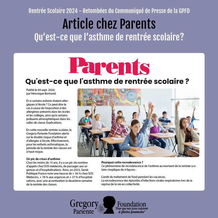 Suite à la communication de la Gregory Pariente Foundation pour alerter sur le double risque d'asthme et d'allergie de rentrée scolaire, Parents a publié le 4 septembre un article pour alerter sur le risque de recrudescence des crises d'asthme lors du retour en classe.