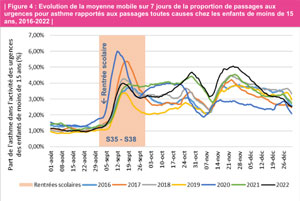 Nous disposons des données chiffrées publiées par Santé Publique France (SPF). Elles se basent sur les bilans hebdomadaires syndromiques (dont l’asthme) réalisés par le réseau Oscours (Passage aux urgences et hospitalisation post-passage aux urgences) et le réseau SOS-Médecins.