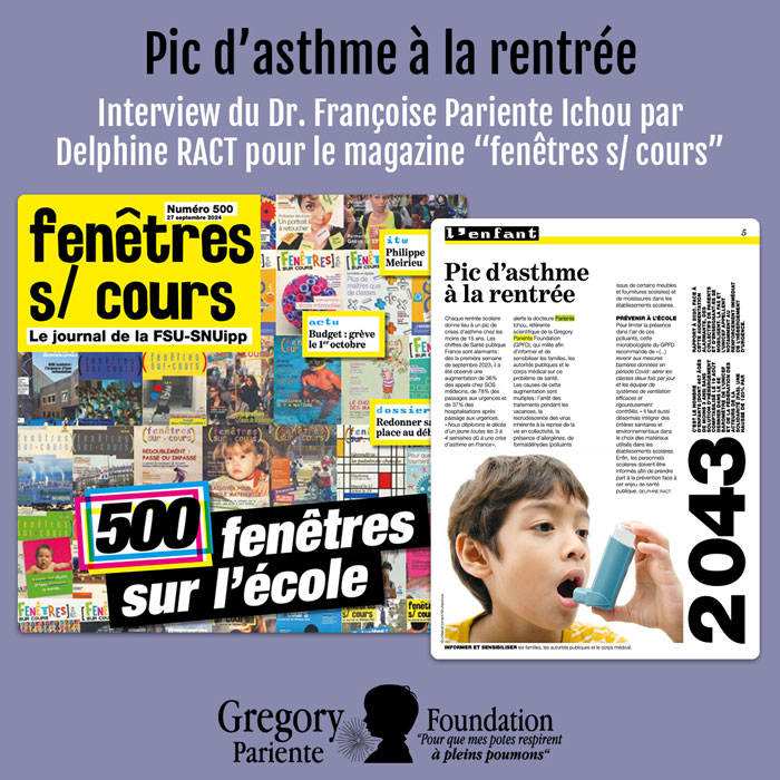 Delphine Ract choisit de lancer sa propre alerte avec ce titre: "Pic d’asthme à la rentrée scolaire, les chiffres de santé publique France sont alarmants". Elle s'appuie aussi sur l'interviewé qu'elle a réalisée avec le Dr. Françoise Pariente Ichou, responsable scientifique de la Gregory Pariente Foundation (GPFD) sur ce phénomène récurrent d’asthme de rentrée scolaire.