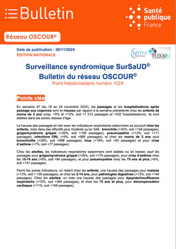 En semaine 45, SPF publie des chiffres qui montrent grâce au réseau Oscours que si "la majorité des indicateurs respiratoires sont stables ou en baisse, on note néanmoins une hausse des recours aux urgences pour Asthme chez les 2-14 ans (+21%) dans un contexte de rentrée scolaire". Cette hausse se poursuit en semaine 46 (+60%).