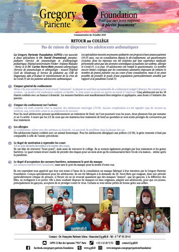 La Gregory Pariente Foundation (GPFD) s’est associée à deux spécialistes le Dr. David Drummond, pneumo- pédiatre (Service de pneumologie et d'allergologie pédiatrique, Hôpital universitaire Necker - Enfants Malades - Paris) et le Dr. Carine Favre-Metz pneumo-allergologue (Service de pneumologie et allergologie - nouvel Hôpital Civil de Strasbourg et Service de pédiatrie au CHR de Haguenau) afin d’évaluer le retentissement de la crise de la Covid-19 sur les patients adolescents asthmatiques.