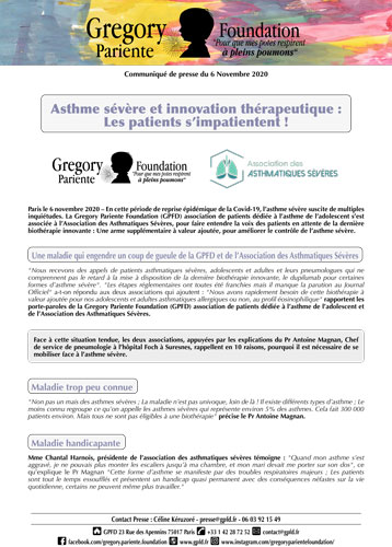 En cette période de reprise épidémique de la Covid-19, l’asthme sévère suscite de multiples inquiétudes. La Gregory Pariente Foundation (GPFD) association de patients dédiée à l’asthme de l’adolescent s’est associée à l’Association des Asthmatiques Sévères, pour faire entendre la voix des patients en attente de la dernière biothérapie innovante : Une arme supplémentaire à valeur ajoutée, pour améliorer le contrôle de l’asthme sévère.