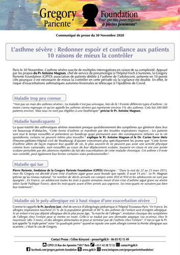 Pierre Pariente, fondateur de la Gregory Pariente Foundation (GPFD) témoigne : "Dans la nuit du 22 au 23 mars 2013, mon fils Gregory est décédé d’une crise d’asthme aigüe grave aussi brutale que rapide. Il avait 14 ans". Le Pr. Magnan précise qu’au niveau national "Le nombre de décès annuels est compris entre 850 et 950 et les adolescents ne sont pas épargnés ; En France, un adolescent toutes les trois à quatre semaines meurt d’une crise d’asthme aiguë grave ou sévère selon Santé Publique France, dont les trois-quarts avant d’être arrivés aux urgences. Les trois-quarts ne suivaient pas bien leur traitement".